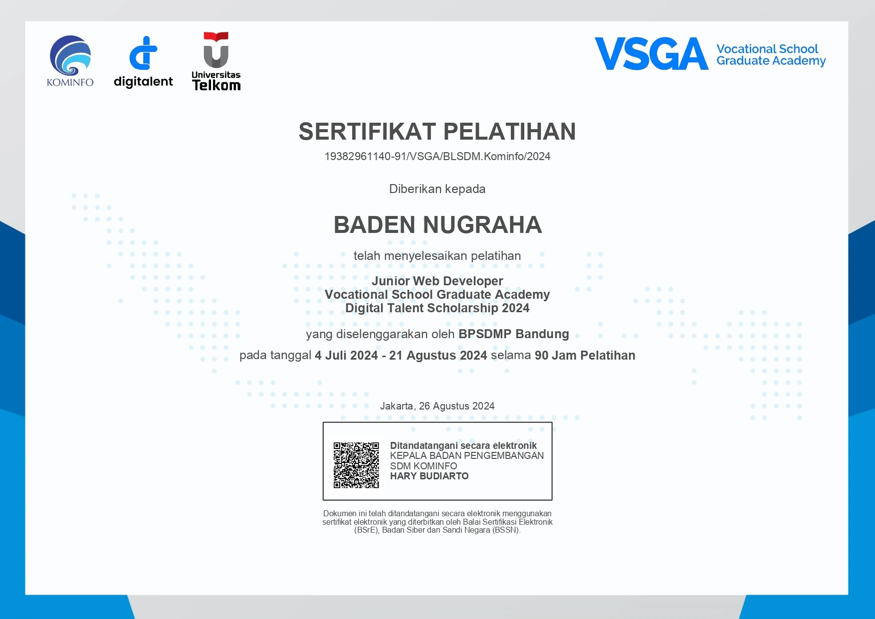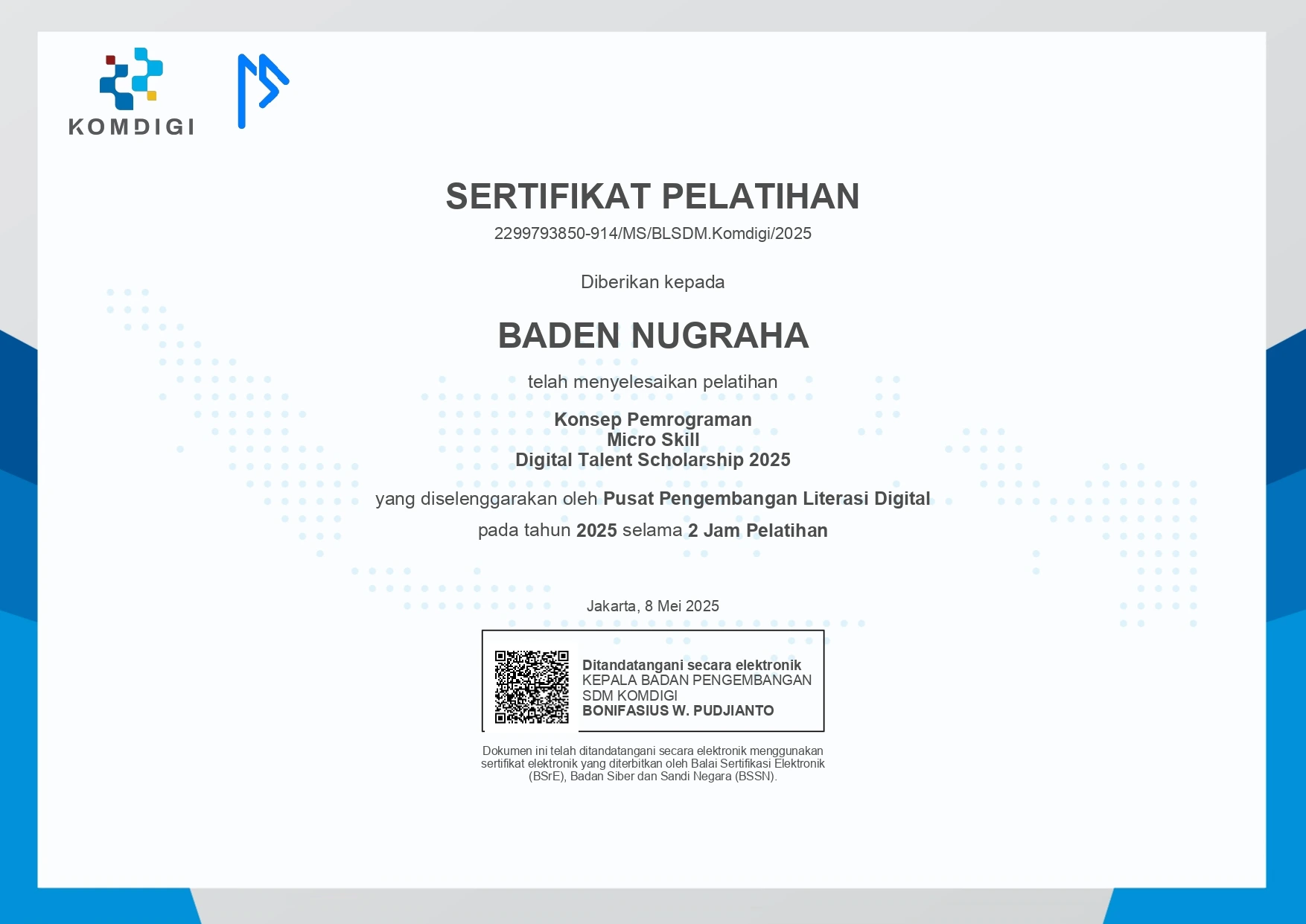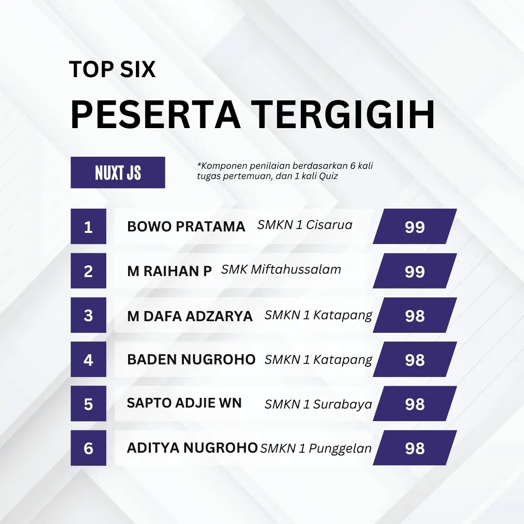 Participated in Progressive Web Apps development using NuxtJS bootcamp. Learned CLI NodeJS and NuxtJS, component and basic syntax, props and conditional rendering, form and event handling, list rendering, routing and request API, state management, authentication and client storage, and front-end app deployment. Achieved recognition as one of the top six participants (Peserta Tergigih) in the SMK Coding program for 2023.